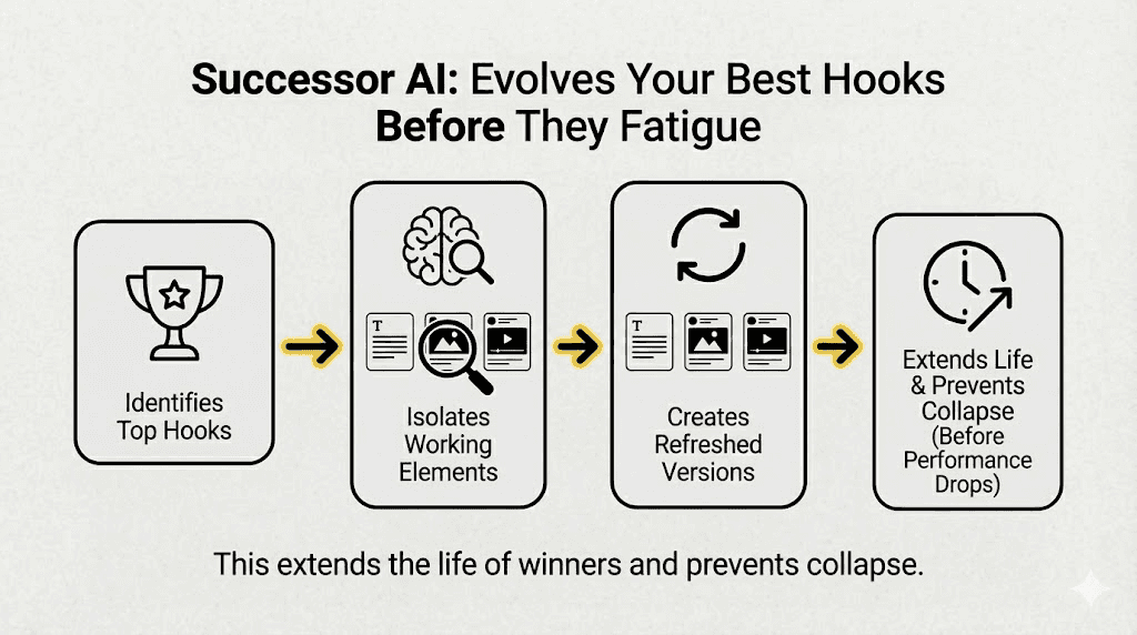 Successor AI identifies top hooks, isolates the working elements, and creates refreshed versions before performance drops. This extends the life of winners and prevents collapse.