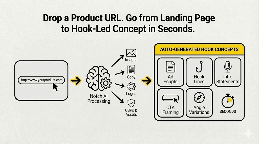 Drop a product URL. Notch fetches images, copy, logos, USPs, and creative assets, then auto generates: