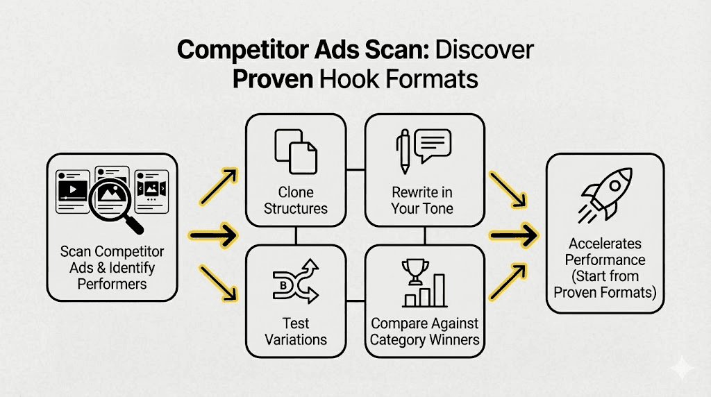 A strong hook can uplift the same creative by 15 to 40 percent. A weak hook can destroy performance even if the rest of the ad is strong. Treat hooks as testable performance assets.