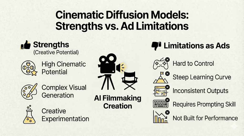 Great for film-like scenes. Less great for CTR, ROAS, and direct-response outcomes.