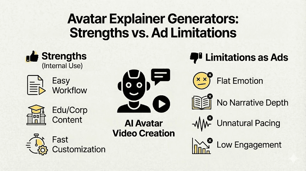 They’re helpful for tutorials, onboarding videos, and training content. While they’re visually consistent, they rarely convert well as ads.