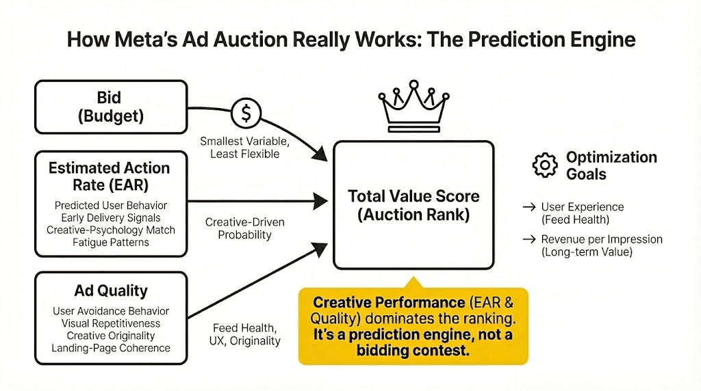 If Meta believes your creative generates worse predicted outcomes than your competitor’s, you lose the auction even if you bid more.
